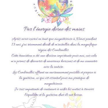 Après avoir exercé en tant que magnétiseuse à Nîmes pendant 13 ans, j'ai récemment décidé de m'installer dans la magnifique région des Combrailles.