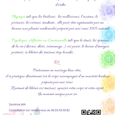 Grâce à mes compétences et mon expérience, je peux vous aider à soulager vos maux et à retrouver un équilibre tant sur le plan physique que mental.